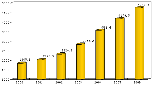 初步核算,2006年全省生產總值4746.5億元,按可比價格計算,比上年增長11.8%。其中,第一產業增加值276.6億元,增長5.1%,對GDP增長的貢獻率為2.7%;第二產業增加值2742.5億元,增長15.3%,貢獻率為72.9%;第三產業增加值1727.4億元,增長7.7%,貢獻率為24.4%。第三產業中,金融保險業增加值138.3億元,增長11.3%;批發和零售業增加值295.6億元,增長11.8%;房地產業增加值118.1億元,增長9.2%。人均生產總值14106元,按2006年平均匯率計算達到1808美元。