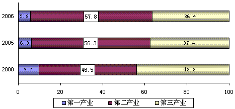 三次產業比例為5.8:57.8:36.4。與上年相比,第二產業比重提高1.5個百分點,其中工業增加值占生產總值的比重達到52.3%,提高1.6個百分點。