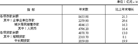 財政收入繼續強勢增長。全年全省完成財政總收入1048.0億元,一般預算收入583.1億元,分別比上年增長38.2%和58.3%?鄢Y源探礦權、采礦權收入,財政總收入和一般預算收入分別為887.3億元和422.4億元,同口徑增長20.3%和21.4%。增值稅、營業稅、資源稅、企業所得稅和個人所得稅五大稅種共計完成稅收281.8億元,分別增長15.7%、22.7%、12.3%、41.7%和14.8%,增收49.6億元,占到財政總收入增量的33.2%。 財政支出結構進一步優化。一般預算支出執行912.0億元,比上年增長36.4%。其中基本建設支出增長7.9%,水利和氣象支出增長17.3%,科學支出增長18.0%,教育支出增長17.7%,醫療衛生支出增長25.0%,撫恤和社會福利救濟費支出增長22.7%,城市居民最低生活保障支出增長17.8%,公檢法司支出增長23.4%,文體廣播事業費增長21.7%。 年末全省金融機構本外幣各項存款余額8656.0億元,比年初增加1529.3億元,與上年相比,多增338.4億元,增長21.5%,增幅同比提高1.5個百分點。各項貸款余額4878.7億元,比年初增加564.3億元,比上年多增297.6億元,增長13.0%,增幅同比提高2.6個百分點。人民幣個人消費貸款171.2億元,下降27.9%,其中個人住房貸款106.7億元,下降28.4%。全年累計現金收入17964.3億元,累計現金支出18087.6億元,貨幣凈投放123.3億元,比上年多投放91.4億元。