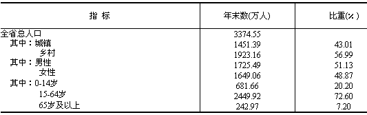 據2006年人口抽樣調查,年末全省總人口為3374.6萬人,比上年末增加19.3萬人。全年全省出生人口38.6萬人,出生率為11.48‰;死亡人口19.3萬人,死亡率為5.73‰;人口自然增長率為5.75‰。