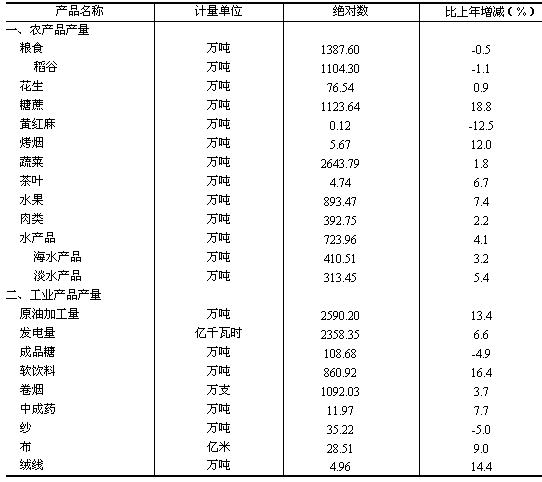 全年糧食作物播種面積2767.10千公頃,比上年下降0.7%。糖蔗種植面積142.69千公頃,增長(zhǎng)13.8%;油料種植面積316.02千公頃,下降0.6%;蔬菜種植面積1185.16千公頃,增長(zhǎng)1.9%。 全年糧食產(chǎn)量1387.60萬(wàn)噸,下降0.5%。糖蔗產(chǎn)量1123.64萬(wàn)噸,增長(zhǎng)18.8%。油料產(chǎn)量77.57萬(wàn)噸,增長(zhǎng)0.7%。蔬菜產(chǎn)量2643.79萬(wàn)噸,增長(zhǎng)1.8%。水果產(chǎn)量893.47萬(wàn)噸,增長(zhǎng)7.4%。茶葉產(chǎn)量4.74萬(wàn)噸,增長(zhǎng)6.7%。 全年肉類(lèi)總產(chǎn)量392.75萬(wàn)噸,增長(zhǎng)2.2%。其中豬肉產(chǎn)量259.53萬(wàn)噸,增長(zhǎng)1.3%;禽肉產(chǎn)量118.78萬(wàn)噸,增長(zhǎng)4.5%。全年水產(chǎn)品產(chǎn)量723.96萬(wàn)噸,增長(zhǎng)4.1%。其中海水產(chǎn)品產(chǎn)量410.51萬(wàn)噸,淡水產(chǎn)品產(chǎn)量313.45萬(wàn)噸,分別增長(zhǎng)3.2%和5.4%。
