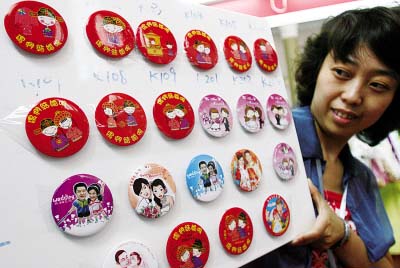 8月17日,第六屆中國(北京)婚博會在北京展覽館舉行。眾多廠商紛紛推出帶有喜慶色彩的婚慶用品,吸引了不少觀眾。圖為一位工作人員正在展示婚慶用的開瓶器。中新社發