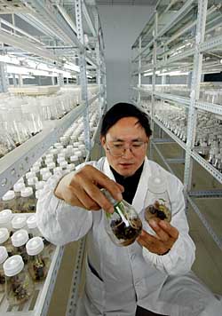 | 恩施魔芋研究所工作人員陳永波在介紹魔芋培養過程。新華社記者 郝同前