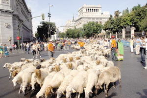 9月9日,一些牧民趕著綿羊在西班牙首都馬德里穿城而過。當天,來自西班牙各地的牧民趕著羊群在馬德里舉行一年一度的穿城游行,目的是引起政府對牧業的重視,要求古老的游牧路線得到保護。