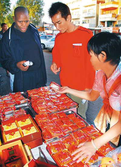 中秋節臨近,南非最大城市約翰內斯堡的一些面向華人顧客的商店紛紛推出各式月餅。圖為9月15日,在該市西羅町唐人街,一名南非顧客(左)在選購月餅。