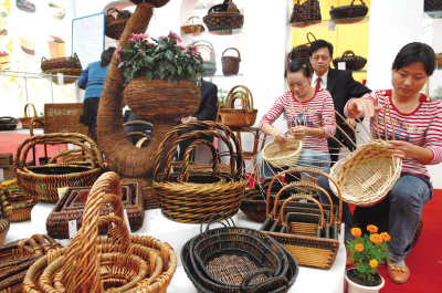 9月25日,“2007中國(guó)安徽名優(yōu)農(nóng)產(chǎn)品交易會(huì)”在合肥開(kāi)幕。圖為兩名技工在現(xiàn)場(chǎng)展示皖西北“柳編”工藝。