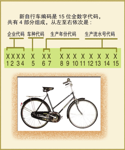 新自行車刻制編碼的工作由生產企業負責在自行車出廠前完成。每輛新自行車的編碼采用的是15位全數字代碼結構,共有4部分組成,從左至右依次是企業代碼、車種代碼、生產年份代碼、生產流水號代碼(如左圖所示)。 自行車的編碼應刻制在自行車車架前管的右側、自行車中接頭的底部或者不影響自行車強度,且易于觀察和讀取的其他部位。編碼可以排成一行,也可以排成兩行。如果排成兩行,前7位必須排在一行,后8位排在第二行。編碼的方向應與前管或中接頭的中心線平行或垂直。編碼可以多處同時標注編碼。編碼刻制的字體高度應大于4mm。要求刻制后,編碼要清晰可見,易于觀察和便于直接讀取,并采取加涂保護層等必要的保護措施,以防編碼腐蝕生銹。