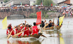 6月19日,農民代表隊激烈角逐。當日,在浙江省蘭溪市赤溪街道楊塘楊大湖,附近九個村莊的農民進行端午龍船賽。 。ū緢筚Y料照片)