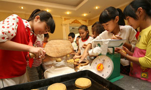 9月22日,農村留守兒童和城里孩子一起學做月餅。中秋佳節將至,河南許昌20多名農村留守兒童和城里孩子一起參加“相聚中秋,城鄉同樂”