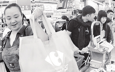 | 在成都一家超市,顧客使用布料制作并收費的環(huán)保購物袋。 |