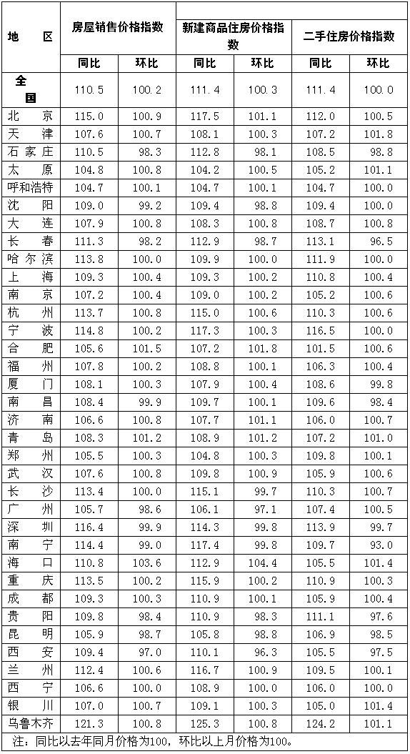 一、新建商品住房銷售價格同比上漲11.4%,漲幅比上月低0.8個百分點;環比上漲0.3%,漲幅比上月低0.7個百分點。分類別看,經濟適用房、普通住房和高檔住房銷售價格同比分別上漲3.9%、12.1%和11.8%,環比分別上漲0.0%、0.3%和0.2%。分地區看,同比漲幅較高的主要城市包括:烏魯木齊25.3%、北海19.3%、惠州19.0%、北京17.5%、南寧17.4%、寧波17.3%、蘭州16.7%、重慶15.9%和長沙15.1%等;環比漲幅較高的主要城市包括:?