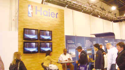 | 圖為NBA球星加里·佩頓在海爾彩電展臺助陣 | 1月8日在美國拉斯維加斯開幕的2008國際消費電子展(CES)上,海爾彩電與三星、夏普等世界一流品牌比肩而立。這一跡象意味著,中國彩電的全球化策略正在漸顯成效。 許多市場分析家認為:中國產(chǎn)品攻占了不少低端消費市場,但欲與國際知名品牌分庭抗禮還為時尚早。而海爾彩電的行動證明,經(jīng)過10年全球化拓展,中國彩電品牌已經(jīng)取得了世界的承認,其產(chǎn)業(yè)位置已經(jīng)置于“世界的中央”。