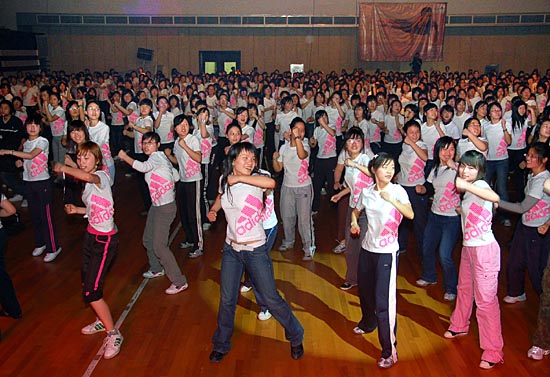 日前,“千人奧運健身活動”在上海舉行,千名年輕女性在健身教練的帶領(lǐng)下,學(xué)習(xí)、體驗有氧搏擊、健身舞蹈等時尚健身運動,以快樂時尚的方式迎接北京奧運會。