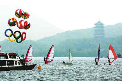 4月8日,“百舸競春,西湖船會”在杭州西湖舉行。上百只各式西湖游船沿著桃紅柳綠的西湖岸邊一路巡游,其間還進行了賽艇、皮劃艇競技表演等多項活動。圖為專業賽艇、皮劃艇在進行競技表演。