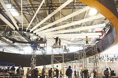 2008(第十屆)北京國際汽車展覽會將于4月22日在北京中國國際展覽中心舉行。本屆車展將有225家海外廠商和1800余家國內廠商參展。圖為14日北京新國展中心,工作人員在一巨大汽車引擎下緊張搭臺布展。