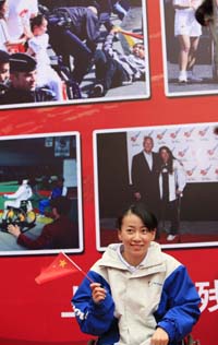 4月13日,在巴黎火炬傳遞活動中全力保護奧運火炬的中國殘疾人運動員金晶從北京回到家鄉上海。圖為金晶在歡迎儀式上留影。