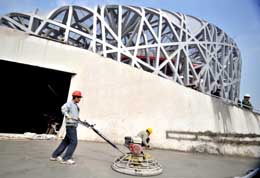 4月11日,工人在國家體育場(“鳥巢”)施工。“好運北京”國際田徑競走挑戰賽4月18日至19日將在國家體育場(“鳥巢”)舉行,這將是國家體育場第一次公開亮相,“鳥巢”也將迎來首批參賽運動員和觀眾。