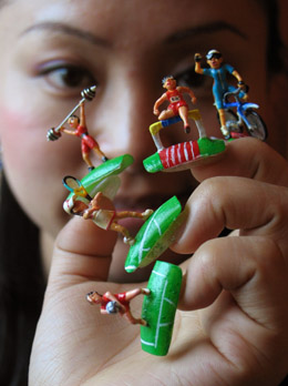 日前,南京美甲造型師金玉耗時兩個多月設計創作了一組奧運主題美甲作品。這組作品共有20多件,用水晶粉等美甲材料制成,包括福娃、可活動的體育人物、奧運場館等系列。圖為金玉在展示“奧運美甲”作品。 |