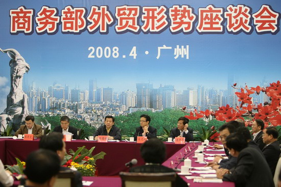 4月15日,第103屆中國進出口商品交易會(廣交會)在廣州開幕。商務部長陳德銘到會視察了廣交會琶洲展館,并邀請部分參加廣交會的地方商務主管部門、進出口商會負責人及企業代表舉行外貿形勢座談會,了解當前我國外貿發展形勢,聽取地方、企業對保持出口穩定增長的意見和建議。 商務部副部長高虎城、部長助理魯建華也參加了座談會。