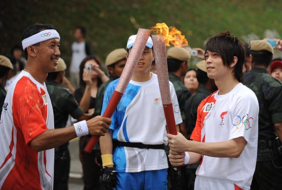| 4月21日,奧運(yùn)火炬手在傳遞過程中進(jìn)行交接。新華社記者 安治平