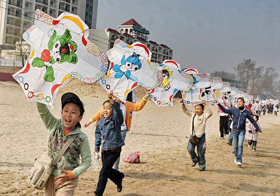 日前,為迎接北京奧運(yùn)會(huì),秦皇島市青少年宮組織近百名老師與學(xué)生一起制作了一個(gè)長(zhǎng)100余米,包括游泳、射擊、自行車、足球等38個(gè)奧運(yùn)會(huì)運(yùn)動(dòng)項(xiàng)目圖案的長(zhǎng)龍風(fēng)箏,并進(jìn)行放飛活動(dòng)。