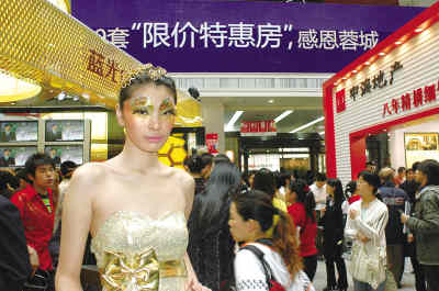 眼下,房地產市場受宏觀調控政策影響人氣低迷,開發商為促銷樓盤,不得不使出各種吸引眼球的“高招”。圖為在成都春季房地產交易會上,某樓盤聘請的職業模特。