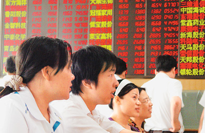 圖為5月5日,海口一家證券營(yíng)業(yè)部里股民正在看盤。