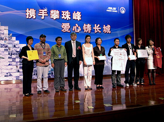 5月19日,以“攜手攀珠峰,愛心鑄長城”為主題的“中國登山英雄載譽歸來暨華碩志愿者凱旋賑災媒體見面會”在北京召開。在珠峰完成火炬傳遞的王勇峰、黃春貴、次落、景陽等四位登山英雄在會上與媒體見面,并當場為四川地震災區舉行義賣捐獻活動,號召更多的人和災區同胞并肩攜手,在珠峰精神的感召和鼓舞下,勇敢地抗擊災害。