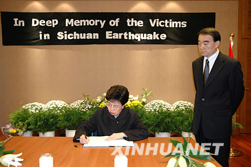 5月20日,在瑞士日內瓦,世界衛生組織總干事陳馮富珍前往中國常駐日內瓦聯合國代表團駐地,吊唁中國汶川大地震遇難者,并稱贊中國的救災工作高效透明。 新華社發