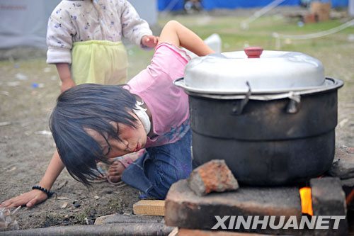 5月24日,10歲的王永霞在北川縣地震災(zāi)區(qū)臨時(shí)安置點(diǎn)內(nèi)生火做飯。王永霞的學(xué)校在地震中被毀了,無法繼續(xù)上課,住在臨時(shí)安置點(diǎn)的她就幫著大人干點(diǎn)力所能及的活,成了父母的好幫手。