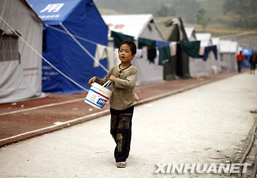5月24日,在四川地震重災(zāi)區(qū)北川縣曲山鎮(zhèn)的一處受災(zāi)居民臨時(shí)安置點(diǎn),一名兒童帶著水桶去打水。新華社記者 才揚(yáng) 攝 |