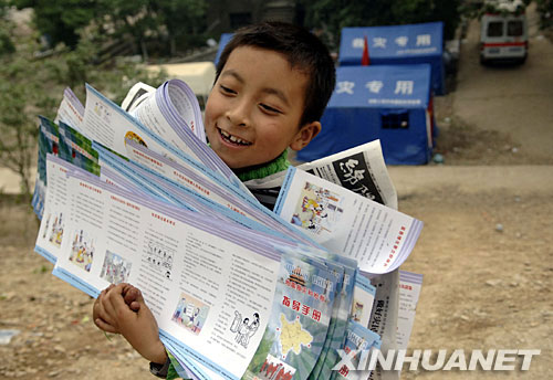 中國(guó)科學(xué)院青年北川希望小學(xué)校舍在地震中部分倒塌,學(xué)校目前仍未復(fù)課。在安置點(diǎn),小學(xué)生們利用搜集到的各種宣傳資料,學(xué)習(xí)地震科普知識(shí)。 新華社記者 李健