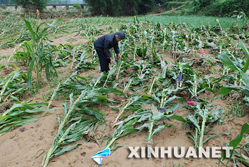 6月2日,在仙回瑤族鄉大中村,一名村民將受災倒地的玉米扶起。