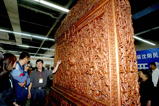 近日,以“喜迎北京奧運盛會,展示民間藝術精品”為主題的2008年沈陽民間藝術博覽會在遼寧工業展覽館開幕,展品包括工藝品、珠寶和收藏品三大類。圖為一位參展商向參觀者介紹大型奧運主題梨木屏風雕刻。