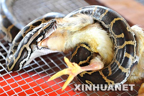 人工孵化的幼蟒在吞食小雞(6月7日攝)。幼蟒從出殼第4天至4個(gè)月之間都以小雞為食。 |