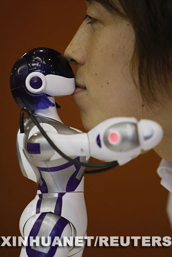 6月16日,日本世嘉玩具公司推出的新型機器人在東京舉行的展示活動上親吻一名男士。