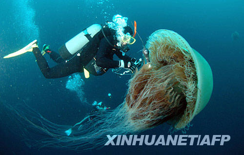 這張2006年10月4日拍攝的照片顯示,在日本北部石川縣小松海邊,一位潛水員在一只水母身上系上傳感器。新華社/法新