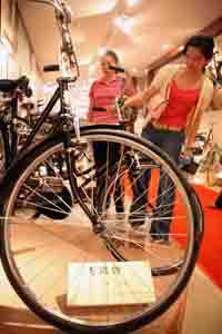 6月21日,觀眾在參觀展出的中國產飛鴿牌自行車。當日,為迎接北京奧運會,即將于今年10月建成的河北霸州自行車博物館啟動了迎奧運先期預展活動。