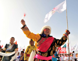 6月22日,蒙古族群眾在慶祝圣火傳遞。當日,北京奧運會圣火在青海省格爾木傳遞。