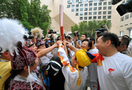 日前,56個民族小使者來到中國銀行總行大廈,“零距離”觸摸了一把“祥云”火炬。