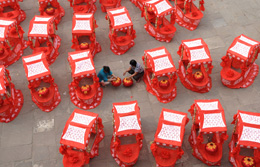 6月22日,在山西省平遙古城的迎薰門南廣場,兩名婦女在為“彩船”準備燈籠,以迎接北京奧運會圣火傳遞活動的舉行。