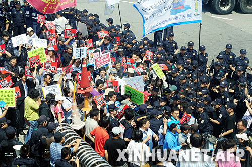 6月26日,在韓國釜山,防暴警察與抗議政府恢復進口美國牛肉的民眾對峙。 新華社/法新