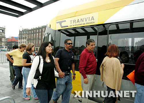 7月5日,墨西哥城聯邦區政府在墨西哥城索卡洛廣場展示將于2010年投入運營的新型有軌電車,同時征求市民意見。這種電車可載客300名。