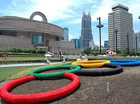 | 迎奧運五環花壇亮相上海人民廣場。新華社發(高曉天攝) |