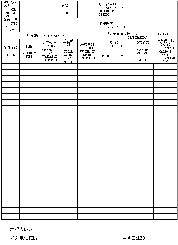 一、填報說明 1.《外國航空公司運輸業務量統計表》是對在中華人民共和國境內民用航空機場起降的外國航空公司航班運量進行統計的定期統計報表,用以反映國際航線運輸規模,為國際航線的運輸組織和管理提供依據。 2.《外國航空公司運輸業務量統計表》分為月報表和年報表,要求在中華人民共和國境內民用航空機場起降的外國航空公司按本表要求向中國民用航空局統計部門填報航班任一起訖點、經停點(技術經停除外)在中華人民共和國境內的航線及城市對運量。 3.《外國航空公司運輸業務量統計表》的月度報表的報送時間不得遲于次月15日;年度報表的報送時間不得遲于次年3月31日。 4.《外國航空公司運輸業務量統計表》的電子模版登載于民航政府網站。外國航空公司應使用該電子模版填報生成本公司的統計報表,并經本公司蓋章后,在規定的時間內將報表和與之對應的電子文檔(EXCEL文件)分別以信函和電子郵件的形式向中國民用航空局統計部門報送。 二、主要指標解釋 1.公司名稱及代碼:填寫航空公司的全稱及代碼,其中,公司代碼采用IATA兩字碼。例如,公司名稱:AIR