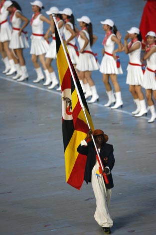 8月8日晚8時,第29屆夏季奧林匹克運動會在國家體育場——“鳥巢”隆重開幕。這是烏干達代表團在開幕式上入場。