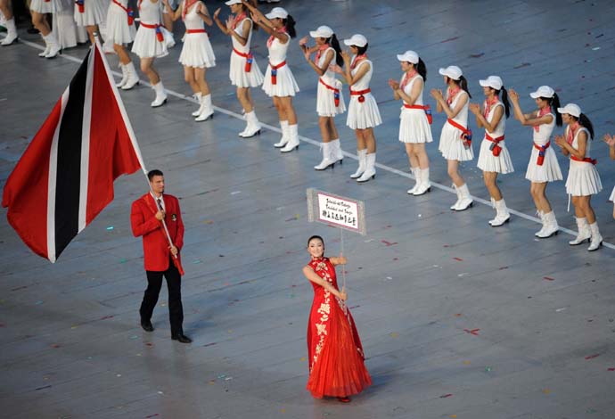 8月8日晚8時,第29屆夏季奧林匹克運動會在國家體育場——“鳥巢”隆重開幕。這是特立尼達和多巴哥代表團在開幕式上入場。