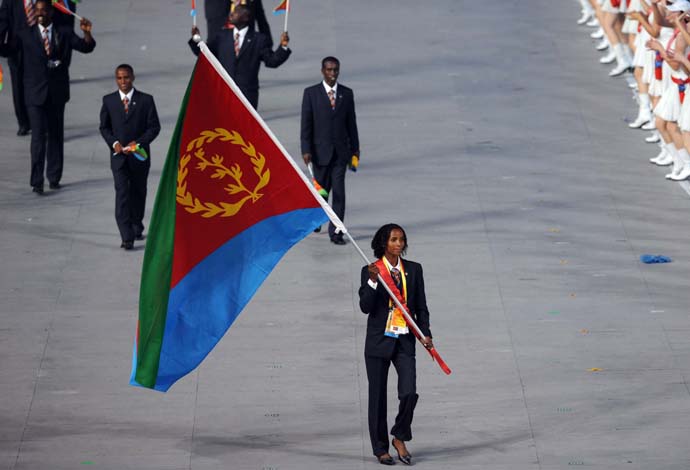 8月8日晚8時,第29屆夏季奧林匹克運動會在國家體育場——“鳥巢”隆重開幕。這是厄立特里亞代表團在開幕式上入場。