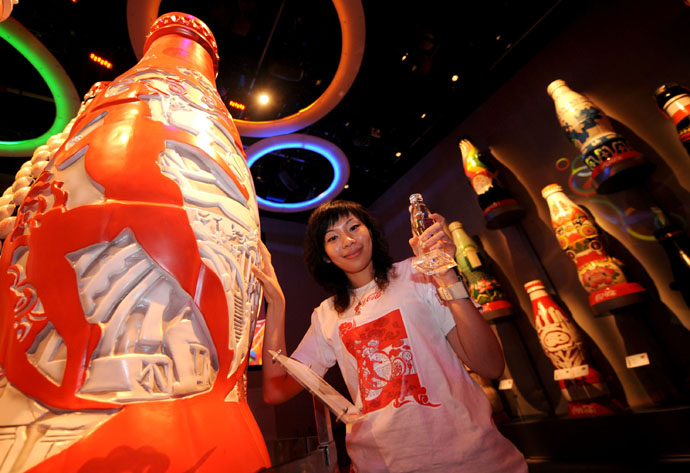 8月9日,來自遼寧的譚慧麗與自己的作品一起合影。當日,在北京奧林匹克公園,來自全國各地的34個可口可樂藝術瓶向公眾展出,精美的“瓶體”藝術品展現中國傳統文化和各地民俗風情,是奧運與文化、商業、藝術的精巧結合。