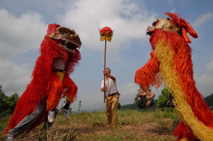 8月9日,村民在表演雙獅搶寶。